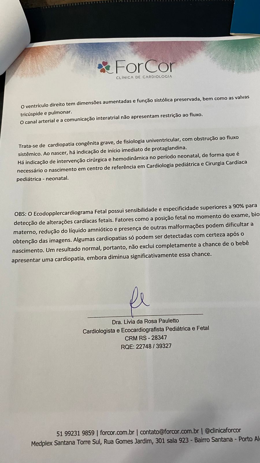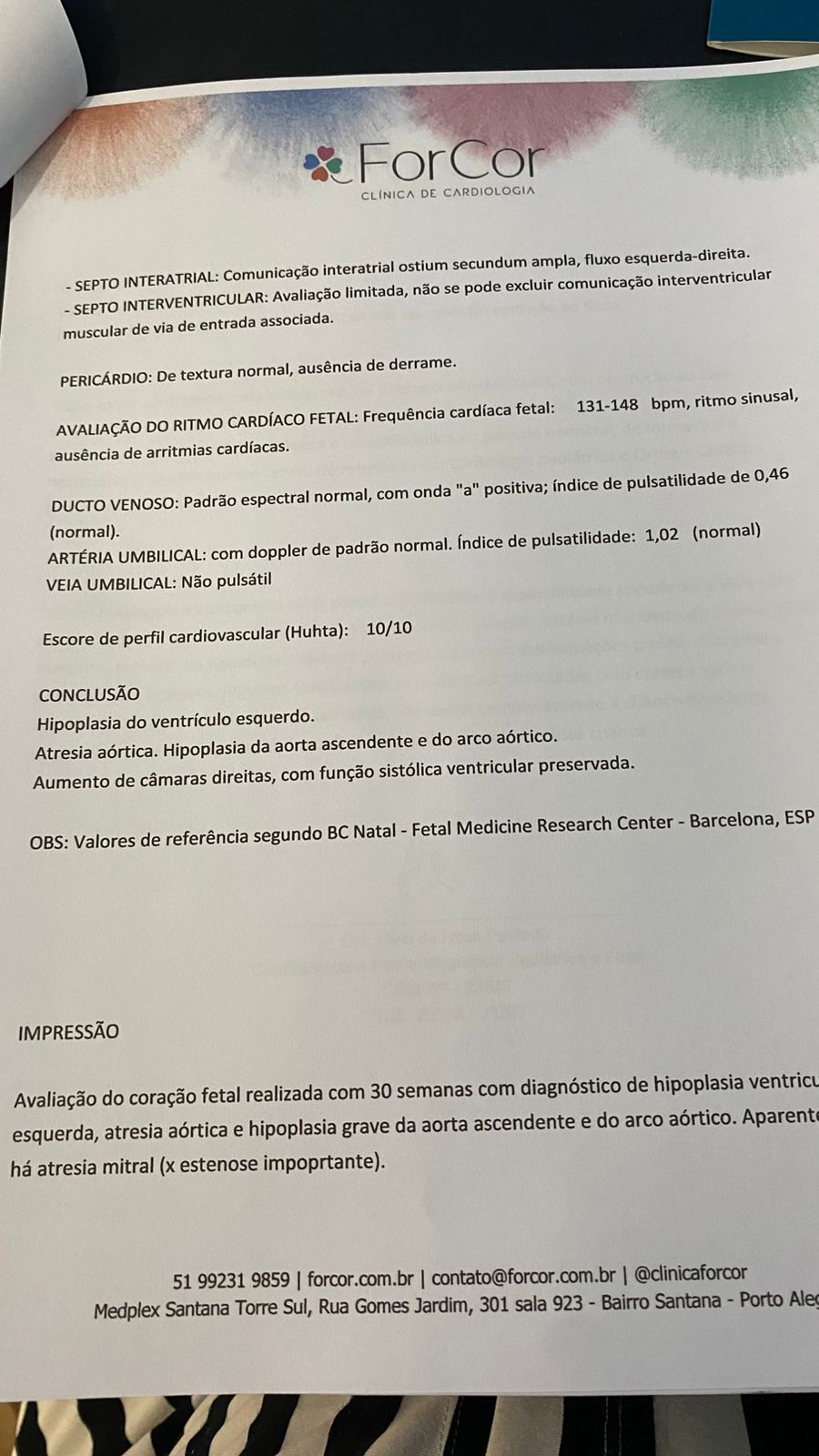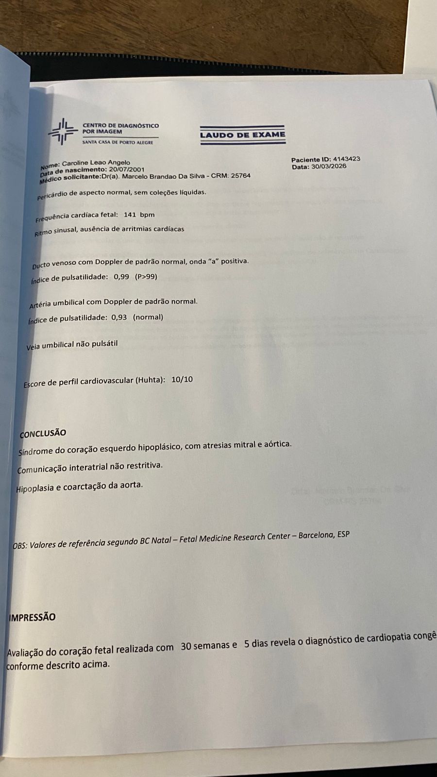 Com 29 semanas de gestação, durante um ecocardiograma fetal, veio o diagnóstico que mudaria tudo: o bebê do casal foi diagnosticado com Síndrome da Hipoplasia do Coração Esquerdo (SHCE), uma cardiopatia congênita grave em que o lado esquerdo do coração não se desenvolve adequadamente, comprometendo a circulação de sangue para o corpo.