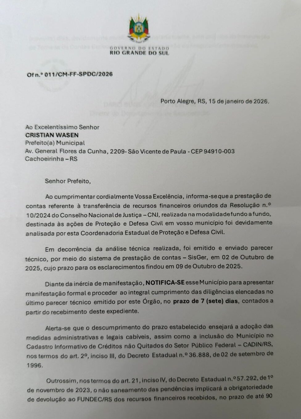 O fato da vez é daqueles que não admitem firula: por perda de prazos em prestações de contas, o município agora corre o risco de ter de devolver cerca de R$ 550 mil em recursos recebidos do Governo do Estado. A conta vem com um “bônus” bem brasileiro: se não resolver, Cachoeirinha pode ser inscrita no Cadin (cadastro de inadimplência), o que na prática pode travar novos repasses e convênios. Ou seja: além de perder dinheiro, a cidade pode perder futuro.