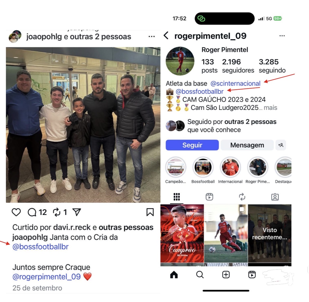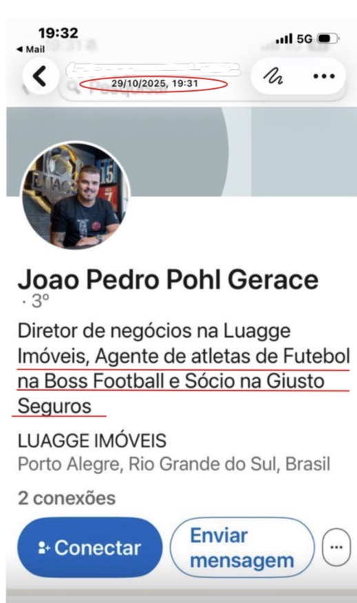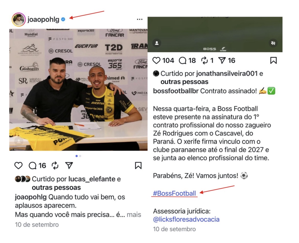 A representação inclui prints de redes sociais que evidenciam a atuação pública de João Pedro como agente. No LinkedIn, ele se apresenta oficialmente na função desde 2021. No Instagram, há diversas imagens dele com atletas assessorados, como José Rodrigues (Futebol Clube Cascavel) e Roger Pimentel (categorias de base do Internacional). Em uma das postagens, João Pedro aparece ao lado do jogador com a legenda: “Janta com o cria da @bossfootballbr”, fazendo menção a uma empresa de agenciamento de atletas.