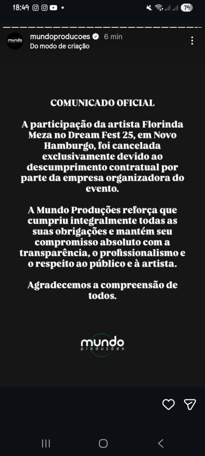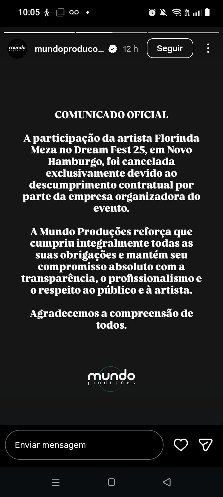 A contradição ficou evidente quando a Mundo Produções afirmou, na tarde deste sábado, que o Dream Fest teria violado uma regra ao confirmar Florinda no evento. Curioso que essa mesma rigidez não apareceu quando a assessoria decidiu que ela não viria mais ao Sul. A comunicação foi falha, desequilibrada e extremamente desrespeitosa com o público gaúcho.