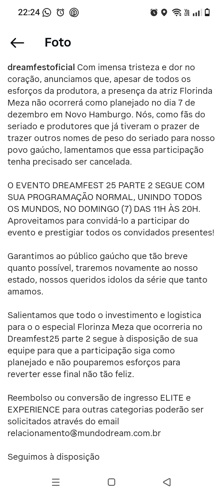 É importante deixar claro: não houve culpa alguma de Florinda Meza. Todo o impasse surgiu entre o Dream Fest, a produção e a assessoria — e quem pagou o preço foram os fãs.