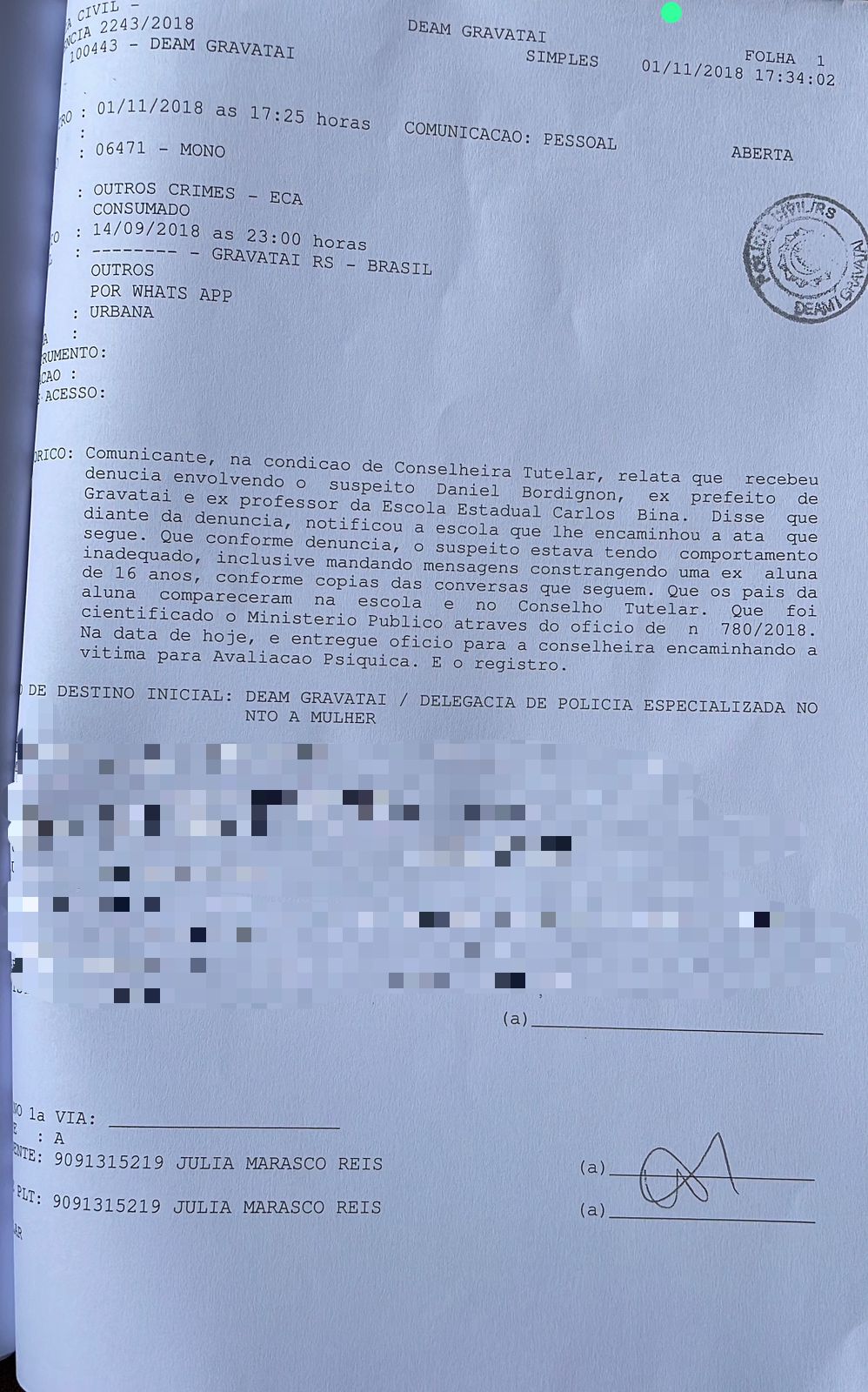 Os documentos também revelam que o assédio não se limitava às mensagens. A menor era constrangida publicamente em sala de aula. Pouco antes de depor no Conselho Tutelar, Daniel Bordignon teria solicitado sua própria exoneração.