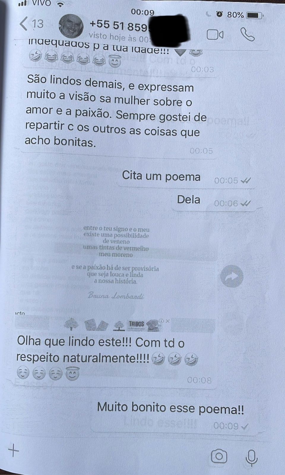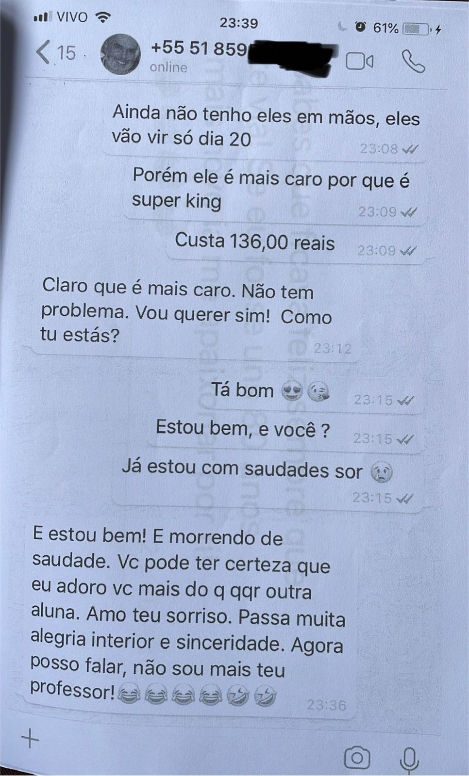 Na continuação da conversa, Bordignon havia pego foto da menor com seu namorado e mandado para ela dizendo que sentia ciúmes. Este print não será revelado por motivos óbvios de proteção a garota.