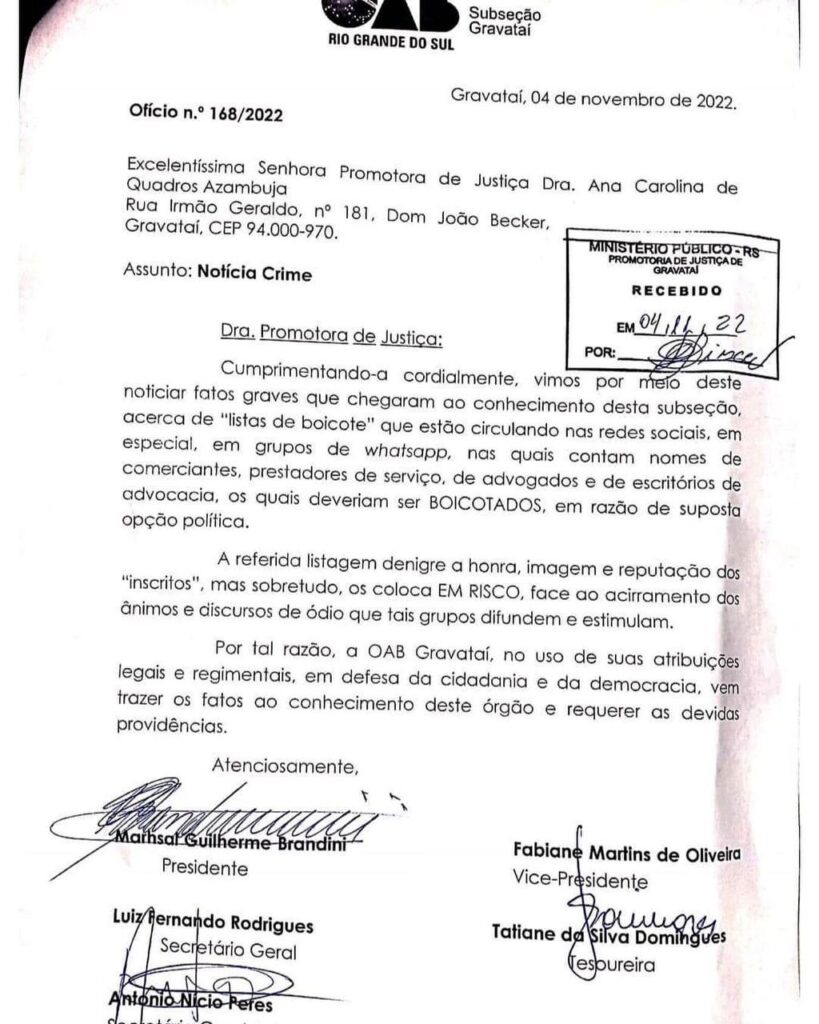 No dia de ontem (04), a OAB Subseção Gravatai, oficiou o Ministério Publico, pela responsabilização cível e criminal daqueles que expuseram comerciantes, prestadores de serviço, escritórios de advocacia e advogados em razão de suposta opção política na nossa cidade. Confira o ofício: