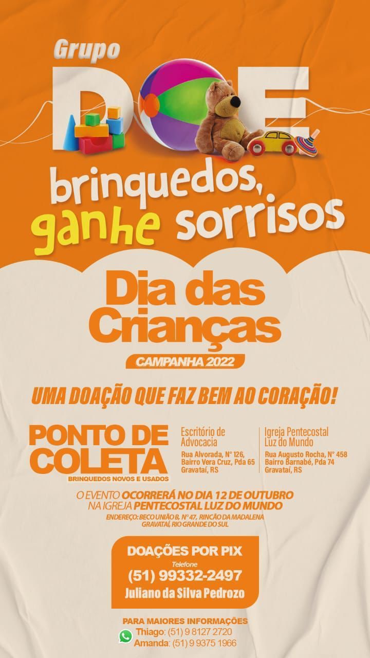 O dia das crianças se aproxima e com isso, a OAB de Gravataí se uniu ao grupo Doe Brinquedos e Ganhe Sorrisos, também de Gravataí, para arrecadarem brinquedos que serão destinados a crianças carentes da cidade.