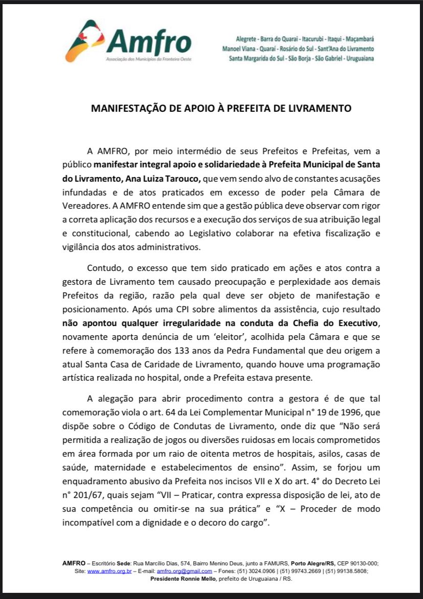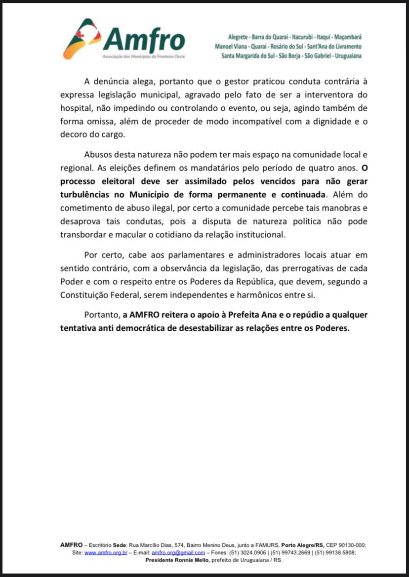 Após esta verdadeira falta de respeito a Amfro – Associação dos Municípios da Fronteira Oeste, emitiu uma nota em apoio a Prefeita, confira: