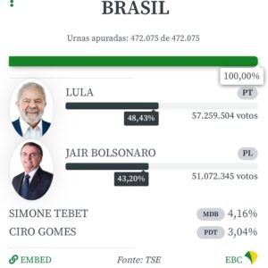 O ex-presidente Luiz Inácio Lula da Silva terminou em primeiro, com 48,43% dos votos, o equivalente a 57.259.504, enquanto o presidente Jair Bolsonaro, que tenta a reeleição, ficou com 43,2%, o equivalente a 51.072.345 votos. Os dois disputam o segundo turno, marcado para 30 de outubro.