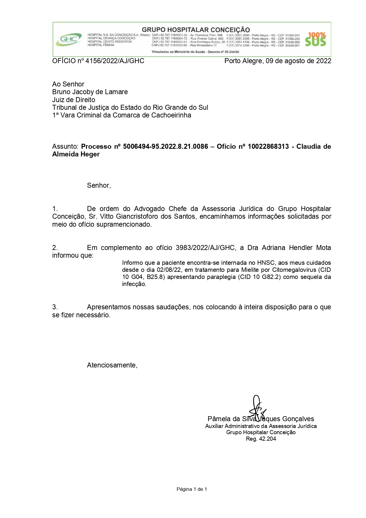 O seu filho continua no IPF e, na condição de advogado, não sei se Cláudia foi buscada por alguém, pois estou em repouso por recomendações médicas.